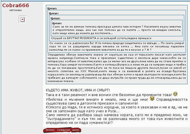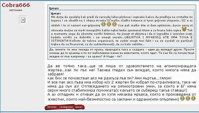 Истинският му мотив не е просто да осигури евтина храна за екзотичните си любимци, а да изпита патологично удоволствие от мъчителната смърт на животинките. Под никове Cobra666, Naja666 King666Cobra той описва екзекуциите си във форуми, публикува заснетите клипове в сайтовете си free.hit.bg/cobra666gallery/ , https://www.freewebs.com/my666snakes/ (вече свалени) и се хвали наляво – надясно с тях, дори пред непознати, като не крие задоволството си от липсата на действащи закони, които да му попречат. Ще излезе ли прав, че е недосегаем?